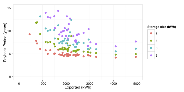 If the difference between your feed-in tariff and your peak import price is 40c/kWh, each kWh of solar energy you store then use during the peak period saves you 40c. The graph above showed an average daily transfer of 4kWh, saving $1.60 per day. But this household requires an 8kWh battery, costing about $9,600. The payback period is over 16 years – beyond the warrantied life of the battery.