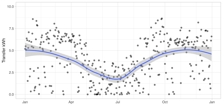 The graph below shows an example of the energy that could be transferred each day of a year, averaged over 40 houses at Lochiel Park, a precinct of low-energy housing in Adelaide.